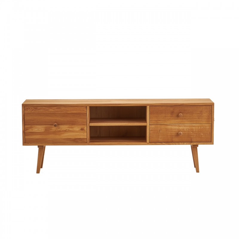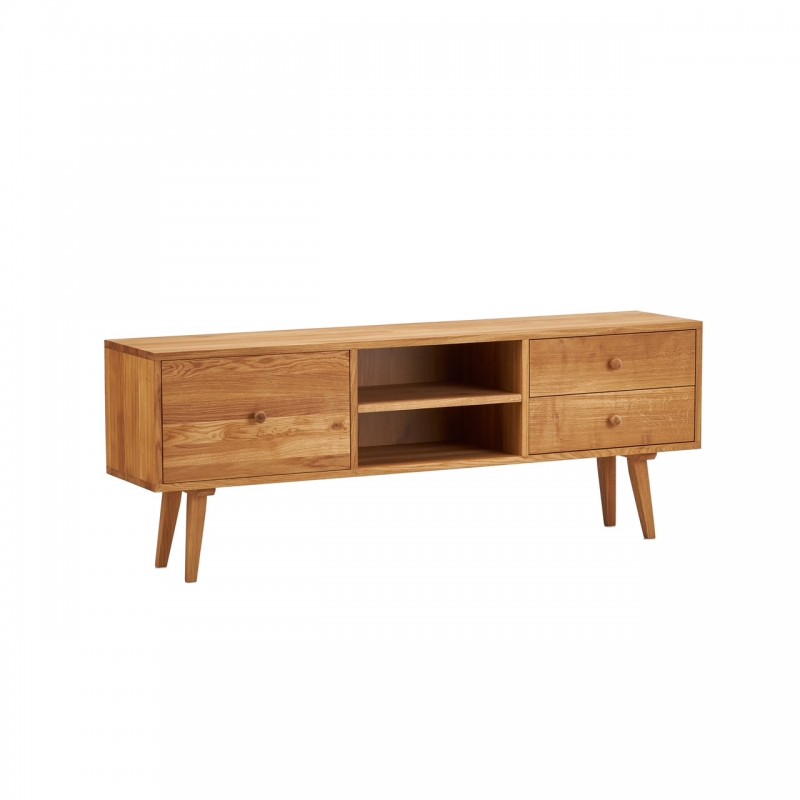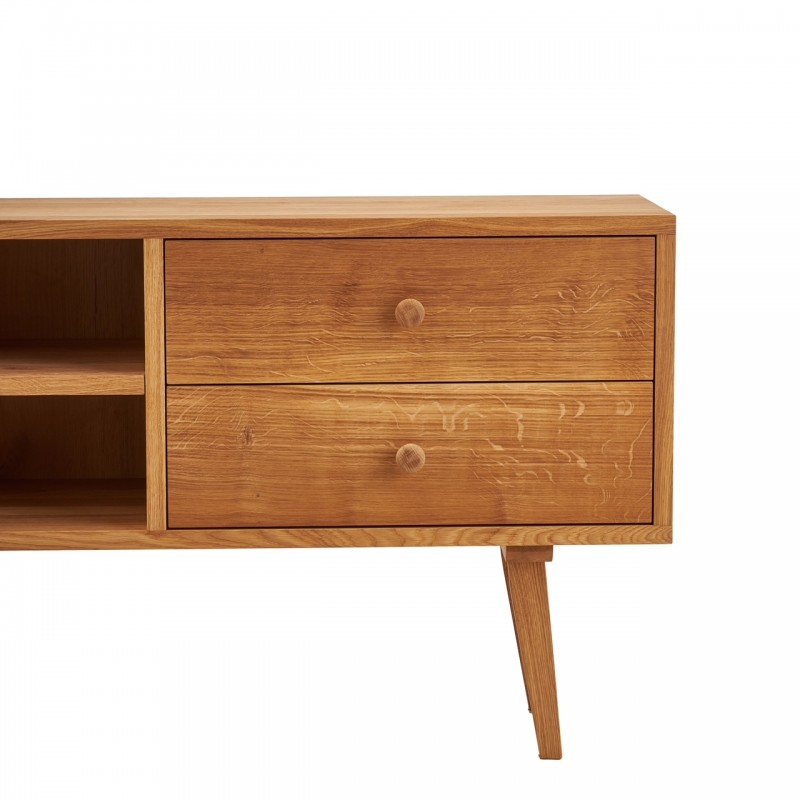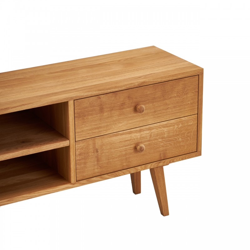 Szafka TV z drewna dębowego. Charakterystyczne dla stylu skandynawskiego lekko skośne nóżki nadają lekkości. Praktyczne półki otwarte i zamykane oraz dwie szuflady na drobiazgi.